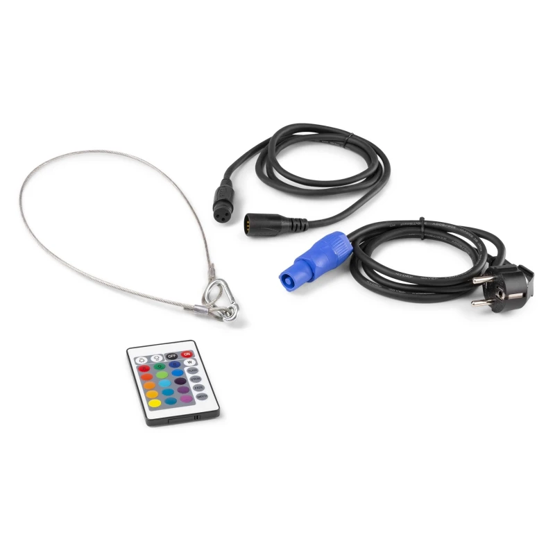 Kaasasolevad tarvikud: Kaugjuhtimispult (juhtmevaba), Paigalduskronstein, Ohutusnöör, Toitekaabel, DMX-kaabel