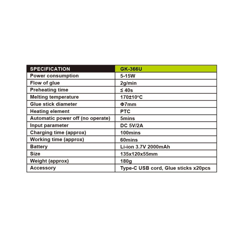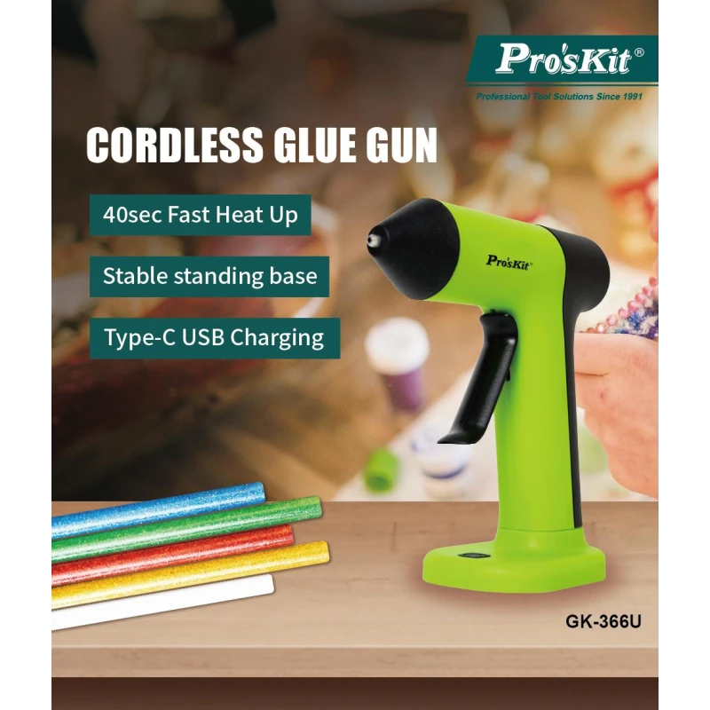 PRO'S KIT GK-366U on juhtmevaba liimipüstol, mis on mõeldud isetegemisprojektideks, majapidamises kasutamiseks ja käsitööks. See pakub mugavat juhtmevaba kasutamist kiire kuumenemisega. Peamised omadused