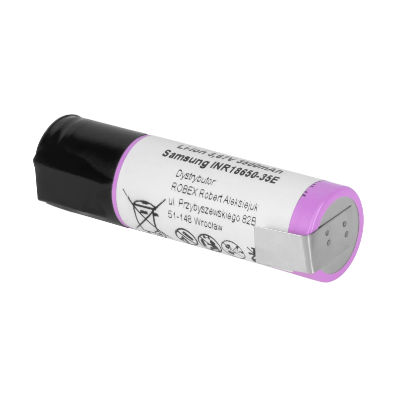 See Samsung SDI INR18650-35E-FT on liitiumioonaku tüüpilise mahutavusega 3500 mAh ja nimipingega 3,7 V, millel on jootekõrvad otseühenduseks.