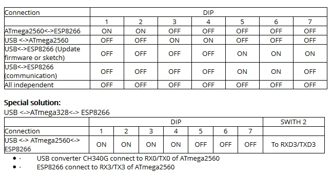 Via USB you can update sketches and firmvare for ATmega2560 and for ESP8266. For this on board have the USB-serial converter CH340G.