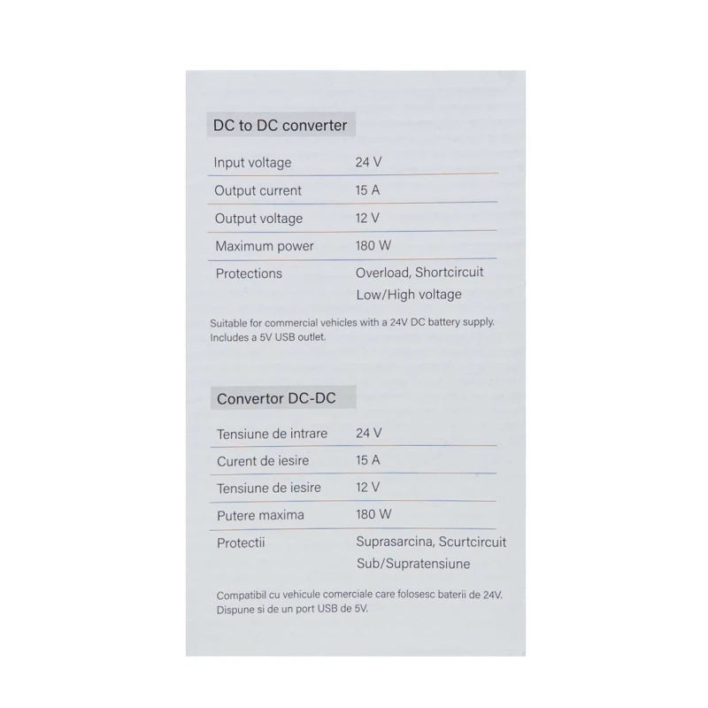 See muundur sobib kasutamiseks veoautodes ja muudes transpordivahendites, mis kasutavad 24 V pardal olevat elektrivõrku, võimaldades neil usaldusväärselt käitada standardseid 12-voldiseid seadmeid.