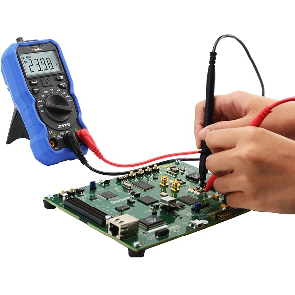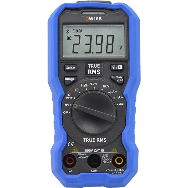 OWON® OW16B digitaalne multimeeter on töökindel ja usaldusväärstete mõõtetulemustega. Seadmel on sisse ehitatud Bluetooth, tänu millele on võimalik lugeda ja analüüsida mõõtmistulemusi läbi nutitelefoni vastava rakenduse. Suur 5999 nümbrinäiduga ja taustavalgustusega ekraan lihtsaks ja mugavaks kasutamiseks. Automaatne väljalülitusfunktsioon patarei kasutusea pikendamiseks. True RMS (TRMS) multimeeter annab täpsema ja usaldusväärsema mõõtmistulemuse pinge ja voolu mõõtmisel võrreldes tavalise multimeetriga. Multimeeter võimaldab mõõta DC/AC pinget ja voolu, takistust, mahtuvust, sagedust, töötsüklit, temperatuuri ja dioodi, lisaks heliga pidevuse test.