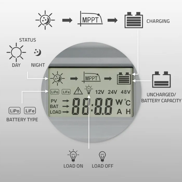 Kasutajakogemust parandab selge ja intuitiivne LCD-ekraan, mis kuvab reaalajas süsteemi parameetreid ja aku olekut. Ohutus on esmatähtis ning seade on varustatud põhjaliku kaitsemehhanismide komplektiga, sealhulgas kaitsega lühise, ülekuumenemise, ülekoormuse ja vale polaarsuse eest. Väline temperatuuriandur tagab veelgi süsteemi ohutu töö, kohandades laadimisparameetreid automaatselt vastavalt keskkonnatingimustele.