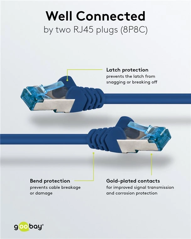 - Sisaldab kullatud kontaktidega RJ45-pistikuid ja integreeritud lukustuskaitset vastupidava ja turvalise ühenduse tagamiseks.
