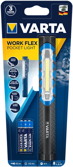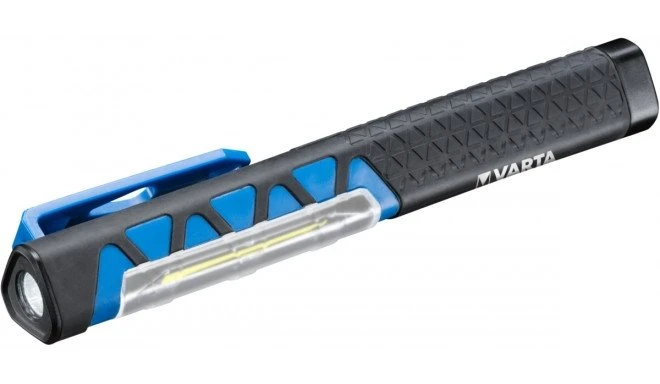 Varta kompaktne ja väike töövalgusti, mis mahub taskusse. Kaal 88g. Lamp on põrutuskindel ja veekindel vastavalt IPX4 standarditele. 2 režiimi: hajutatud ja kitsas valgusvihk. COB LED tehnoloogia tagab ideaalsed valgustingimused. Lambil on klamber, millega seda tasku külge kinnitada. Kummist käepide. Veeremisvastane disain. 110lm. Tööaeg kuni 6h. Valgusvihk ulatub kuni 40m kaugusele. Töötab 3x AAA patareidel.