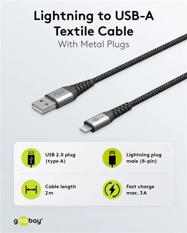 Lightning USB-A Textile Cable with Metal Plugs, 2 m