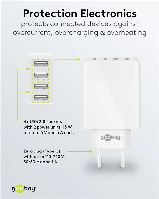 Small, yet larger than life! With four ports, the compact charger combines the power of four individual USB power supply units – fits in any pocket or bag and is perfect at home, in the office and when travelling.