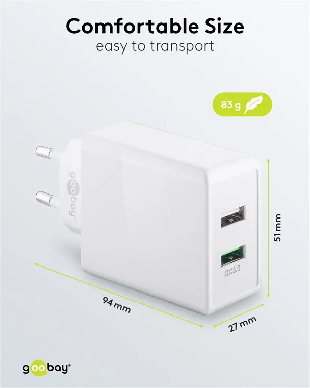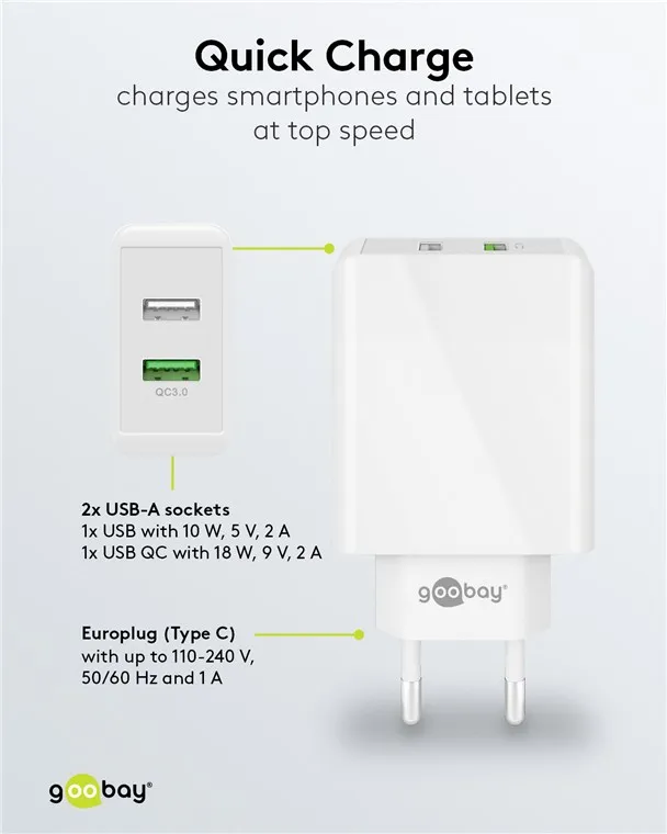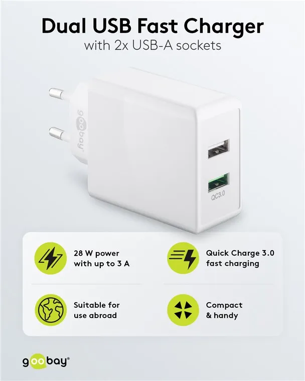 With its Quick Charge function, the turbocharger among the charging plugs ensures ultra-fast charging of mobile phones, tablets, headphones, smartwatches or cameras. With two USB-A ports, the charger is super flexible and super compact – perfect at home and when travelling.