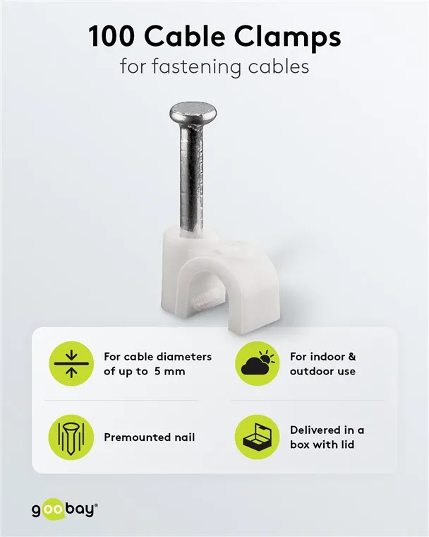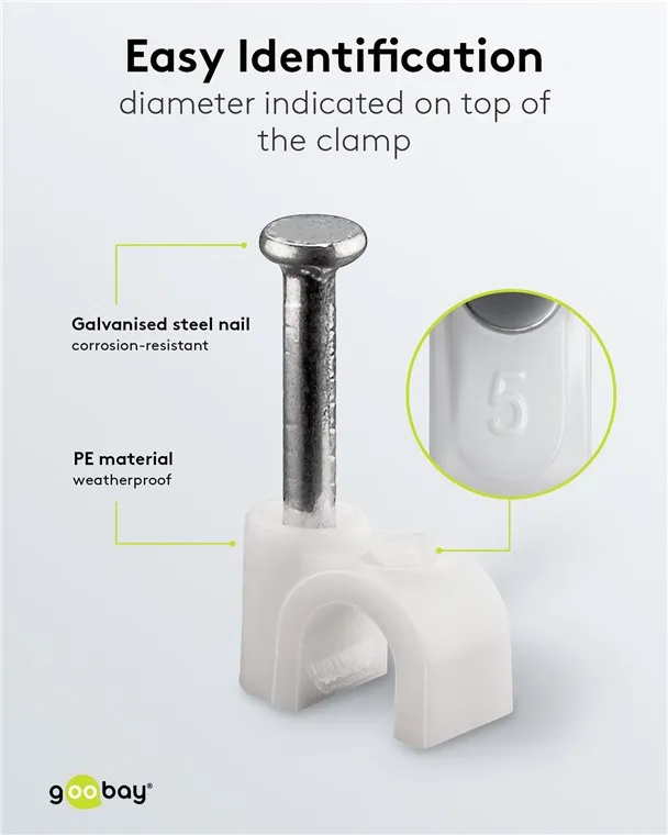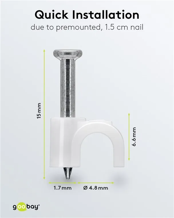 Cable organizer that is ideal for laying cables on walls, door frames and corners. High-quality stabilised PE plastic and galvanised steel nails. You may use the cable clips with nail indoors and outdoors and achieve good insulation, corrosion resistance and aging resistance.