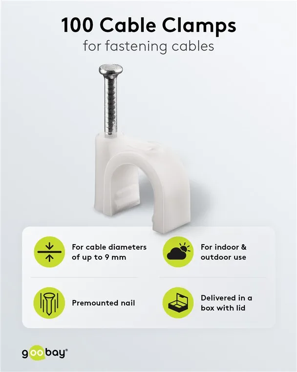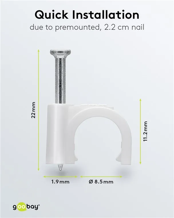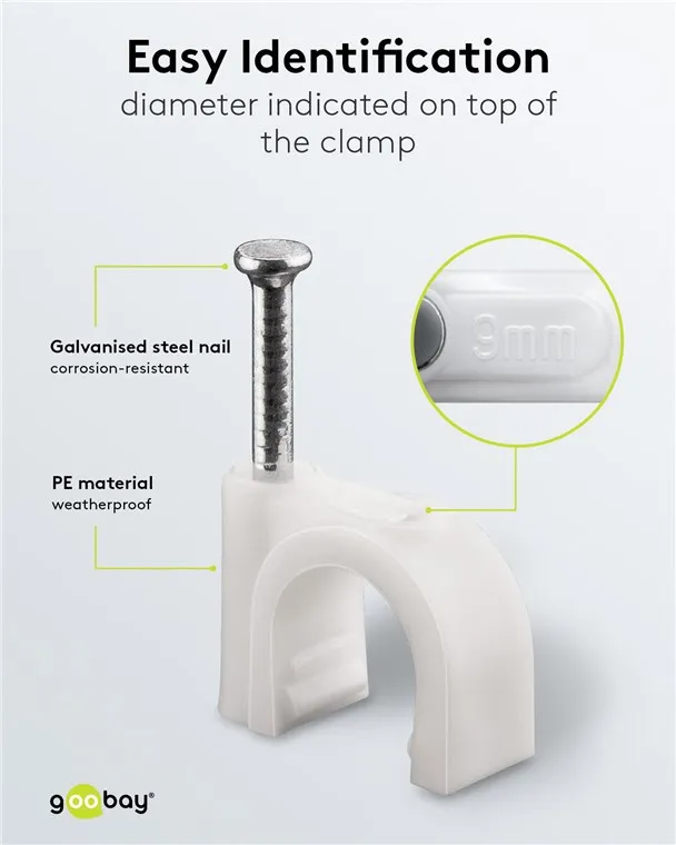 Cable organizer that is ideal for laying cables on walls, door frames and corners. High-quality stabilised PE plastic and galvanised steel nails. You may use the cable clips with nail indoors and outdoors and achieve good insulation, corrosion resistance and aging resistance.