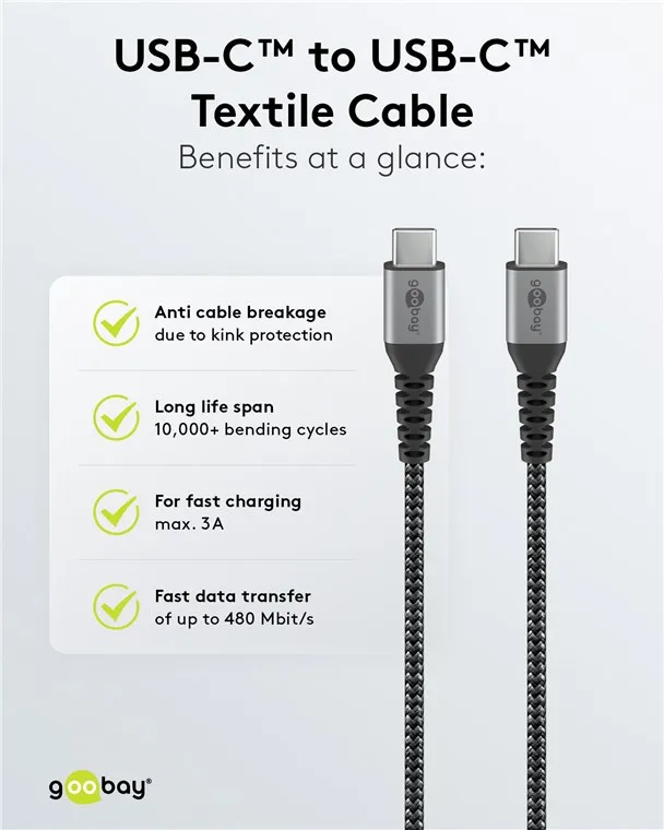The designer piece among the charging cables: The Goobay USB cable impresses with its robust textile sheath and matt silver aluminium plugs. On the technical side, the cable convinces as a reliable power supply and with its fast data transfer between all USB-C™ devices – ideal for smartphones, cameras, headphones, smartwatches or tablets.