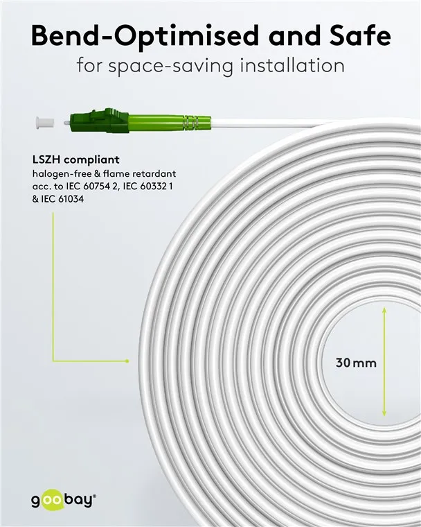 The patch cable is suitable for private and industrial applications, including fibre to the home (FTTH), and is compatible with the FTTH options of a wide range of telecom providers. Thanks to an optimised bend radius of the fibre optic cable, space-saving installation is possible without increasing attenuation and risking interference.