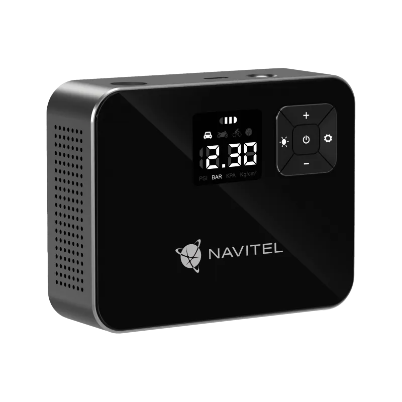 Digitaalne ekraan ja sisseehitatud manomeeter Tänu eredale digitaalsele ekraanile näete vajalikke näidikuid isegi täielikus pimeduses. Kasutage NAVITEL AIR 15 AL-i mitte ainult rehvide täitmiseks, vaid ka neis oleva rõhu kontrollimiseks. Ühendage seade ja lülitage toide sisse ning ekraanil olev algväärtus näitab praegust rehvirõhku.
