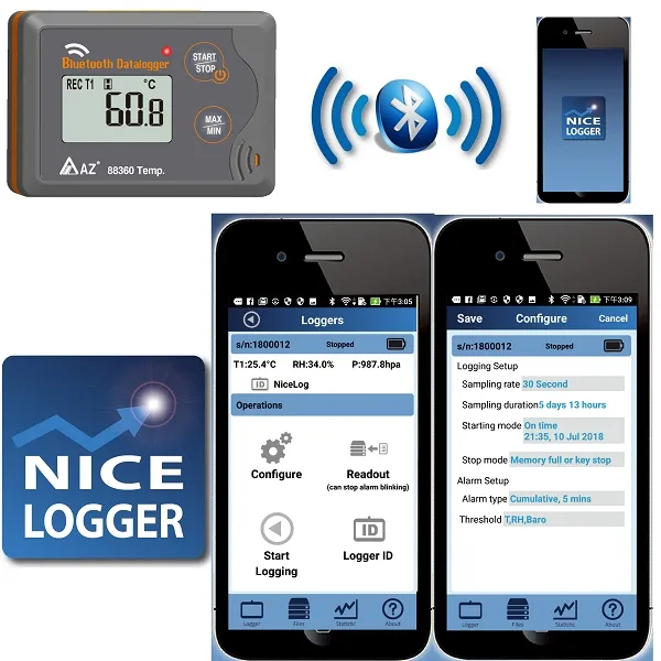 AZ88360 juhtmeta temperatuuri salvestamise seadme omadused: * Loggeri programmeerimine ja andmete traadita allalaadimine Bluetooth 4.0 tehnoloogia abil * Kulude kokkuhoid salvestusandmete kogumisega sekunditega* Nutiseadmetele on saadaval tasuta iOS ja Android APP * Palun otsige APP-poest sõna "Nice Logger"* Looge ja saatke PDF-aruanne läbi APP-i * Aruanne sisaldab andmete kokkuvõtet, graafikut ja üksikasjalikke andmeid* Suur LCD-ekraan pakub reaalajas andmeid iga 5 sekundi järel. * Oleku- ja häireindikaatoritena kasutatakse kahevärvilist LED-i* Kontrollige varasemate temperatuuriandmete Max & Min väärtusi AZ88360 Bluetooth-termomeetrit salvestajat võib kasutada lao, tööruumi, laborite, keldri, veinikeldri, lennukikabiinide, külmutusauto (külmketi logistika), toiduainete transpordi / logistika / töötlemise hoiukonteinerite, inkubatsiooniprotsesside,haudejaamade, kunstigaleriide, muuseumide, HVAC-väli või muude kontrollitave keskkondade.mõõtmiseks. Seda võiks kasutada ka välistermomeetrina. Seda saab kasutada transpordi ametliku jälgijana või farmaatsiatööstuses, haiglas, laboris, tehases või muus tööstuskeskkonnas. See võib olla parim vahend kvaliteedikontrolli nõuete jälgimise kontrollimiseks.