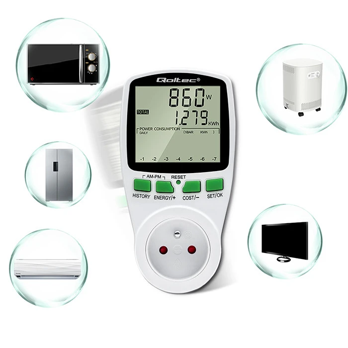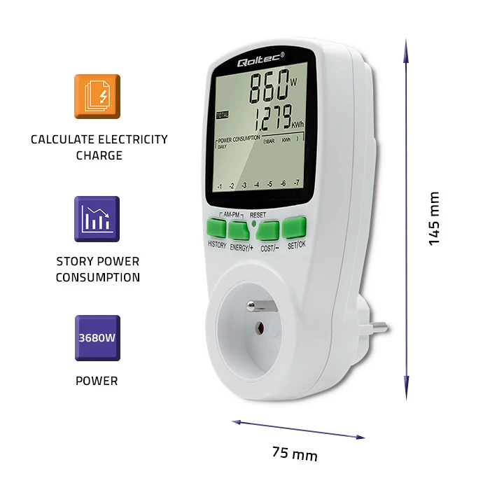 Using the Qoltec power consumption meter, you gain precise readings, not estimates, so you are able to accurately calculate the cost of the electricity consumed and check the effectiveness of the saving methods you are using.