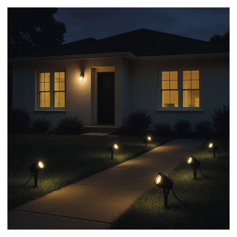 - Fokuseeritud valgustus: Igal prožektoril on kitsas 30° valgusvihu nurk, mis sobib ideaalselt konkreetsete maastiku- või arhitektuurielementide täpseks esiletõstmiseks.