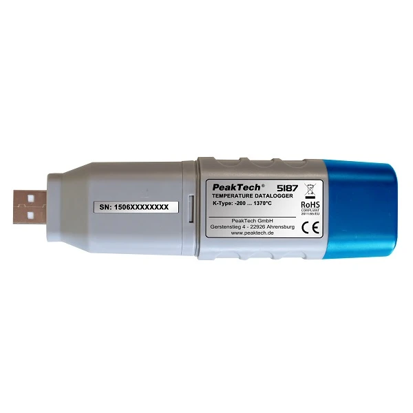 PeakTech® 5187 temperatuuri loger võimaldab mõõta K-tüüpi anduriga temperatuuri vahemikus -200°C...+1370°C. Kaasas oleva tarkvaraga on võimalik seadistada logeri parameetrid, nagu näiteks mõõtesagedus, käivitusrežiim, kell ja kuupäev ning isegi salasõna, et andmeid kaitsta.