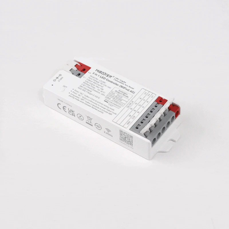 E3 seeria juhtplokid on mõeldud juhtima 3-5 värvilisi süsteeme, mis on 12/24V. Juhtplokil on kanali (värvi) kohta kuni 6A voolu lubatud, kokku 12A. Antud Wifi+RF kontroller saab võtta signaale vastu telefoni rakenduselt ja ka lisaks MiBoxer 2.4GHz pultidelt. Nupu kaudu on võimalik režiimi muuta 3/4/5-värvilise vahel.