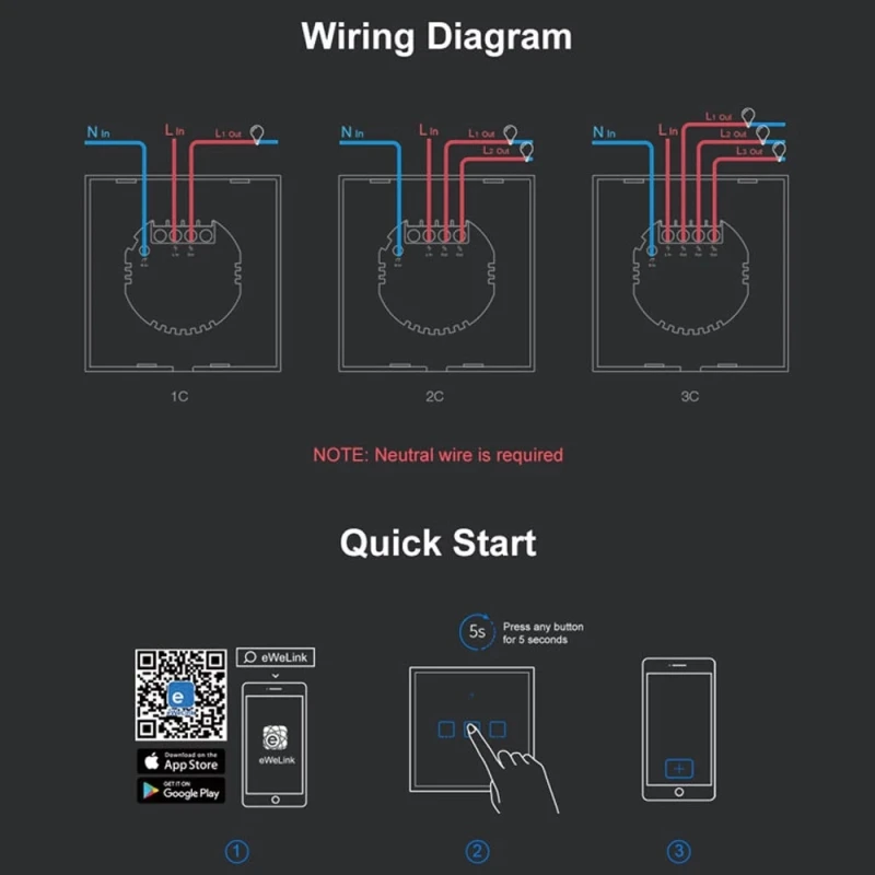 Sonoff T2 EU puutetundlik seinalüliti Wifiga + RF, 3 kanalit