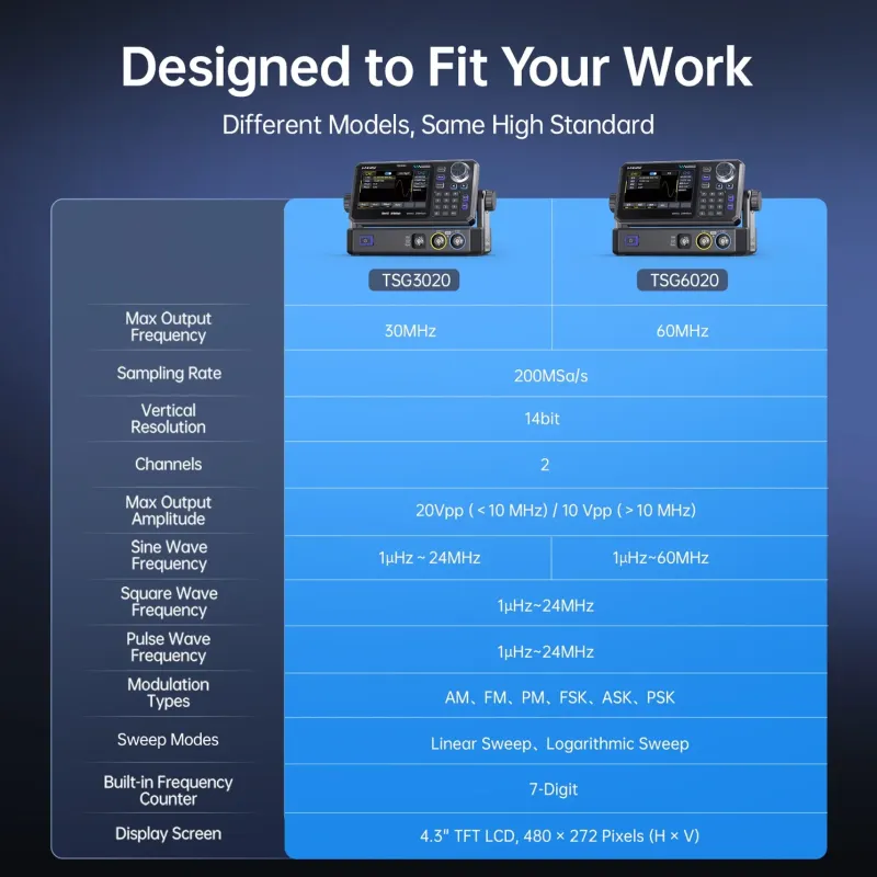 Intuitiivne 4,3-tolline TFT-LCD puuteekraan koos füüsiliste nuppudega muudab seadme kasutamise kiireks ja mugavaks. Olgu tegemist keeruliste modulatsioonide (AM, FM, PM, FSK, ASK, PSK) seadistamise või sageduse pühkimise analüüsiga, TSG6020 pakub selget ülevaadet ja täpset kontrolli. Sisseehitatud 7-kohaline sagedusmõõtja ja efektiivne jahutussüsteem tagavad seadme pikaajalise stabiilsuse igas töökeskkonnas.