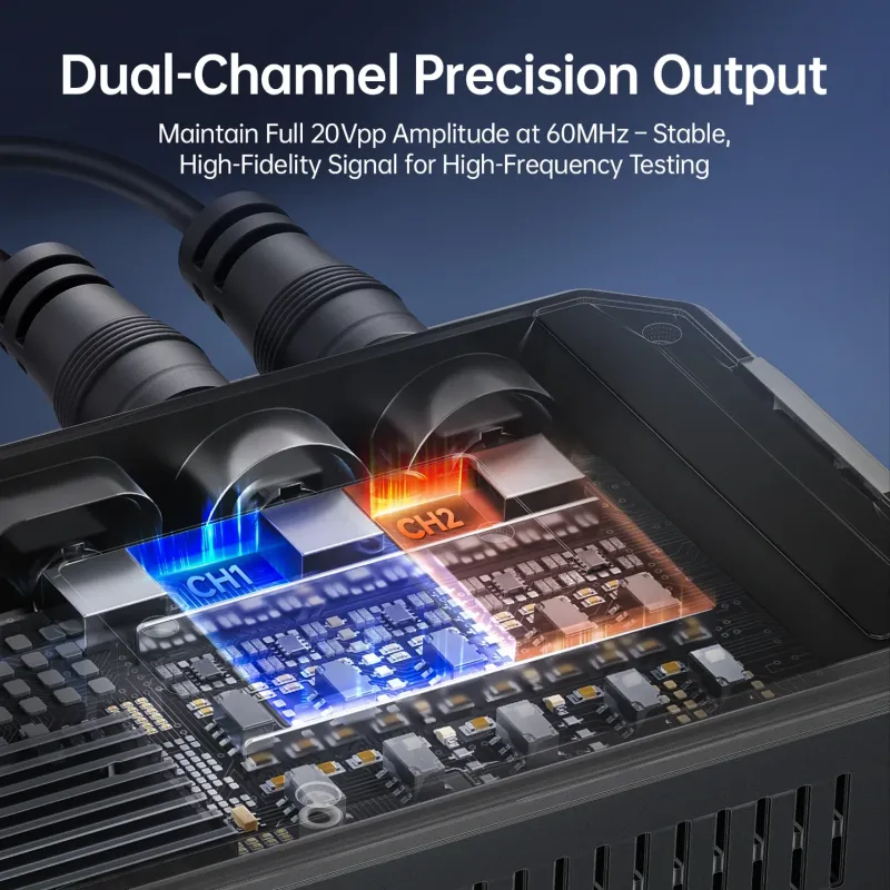 FNIRSI TSG6020 on tipptasemel kahekanaliline signaaligeneraator, mis pakub professionaalset täpsust tänu 200 MSa/s diskreetimissagedusele ja 14-bitisele vertikaalsele resolutsioonile. See on mitmekülgne tööriist, mis suudab genereerida nii standardseid lainekujusid kui ka kasutaja poolt määratud suvalisi signaale, olles asendamatu abiline arendustöös ja elektroonika testimisel.