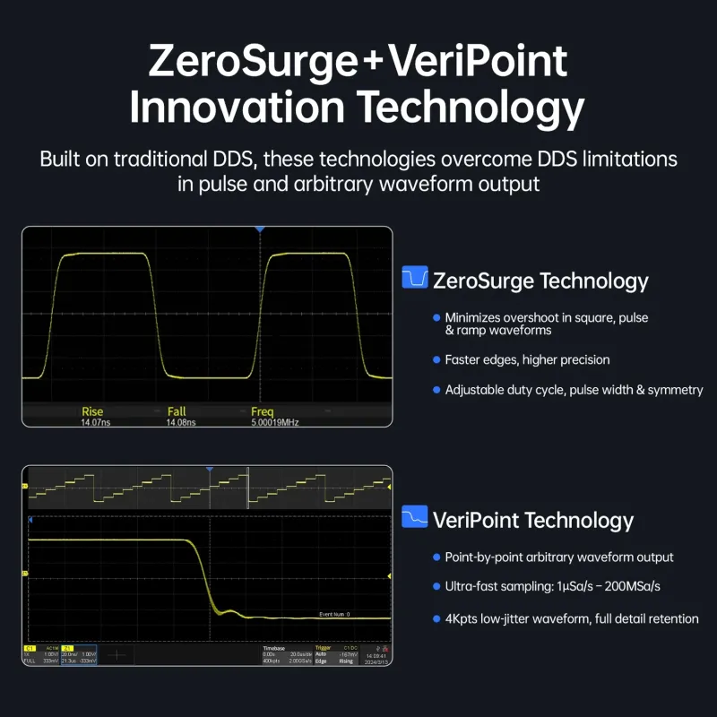Seade on varustatud ZeroSurge tehnoloogiaga, mis minimeerib signaali ülevõnkeid (kuni ≤1%) ja tagab ülikriitilised tõusu- ja langusajad, luues puhtad ja selged impulssignaalid. Tänu VeriPoint tehnoloogiale on võimalik saavutada täpne poindipõhine väljund, mis säilitab kõik lainekuju detailid minimaalse värina ehk jitter’iga.