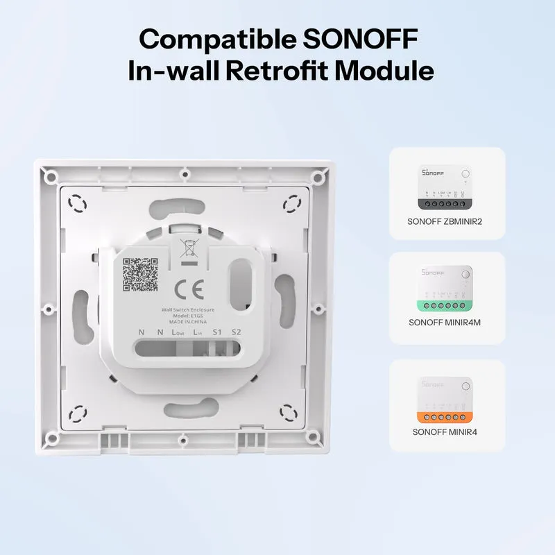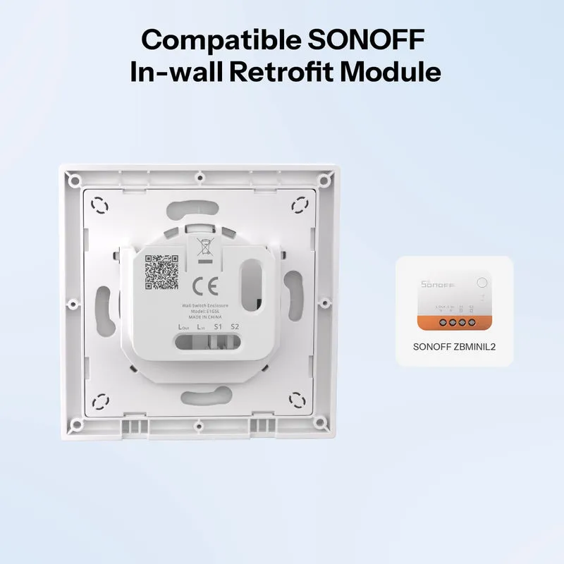 SONOFF Fusion Series 1-Gang (E1GS) seinalüliti korpus on spetsiaalne lisaseade, mis on loodud teenima nii füüsilise esipaneeli kui ka paigalduskorpusena ühilduvatele SONOFF MINI nutimoodulitele (ZBMINIR2, MINIR4M, MINIR4), mis vajavad neutraaljuhtme ühendust. See tagab puhta ja professionaalse viimistluse, tagades samal ajal laia ühilduvuse standardsete elektripaigaldistega.