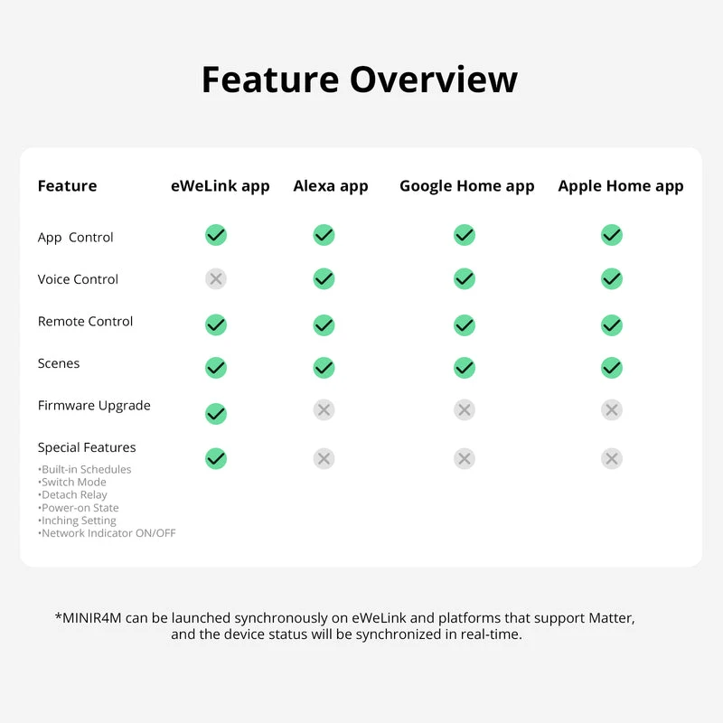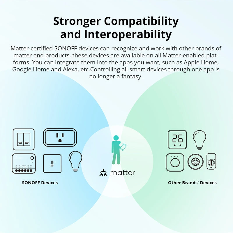 SONOFF MINIR4M on revolutsiooniline Matter-sertifikaadiga nutikas lüliti, mis toob teie nutikodusse universaalse ühilduvuse. Olles SONOFF-i esimene Matter-seade, võimaldab see sujuvat integreerimist suurte ökosüsteemidega nagu Apple Home, Amazon Alexa, Google Home ja Samsung SmartThings. See tähendab, et saate juhtida kõiki oma seadmeid ühest rakendusest, sõltumata brändist, tagades tulevikukindla ja ühtse nutikodu kogemuse.
