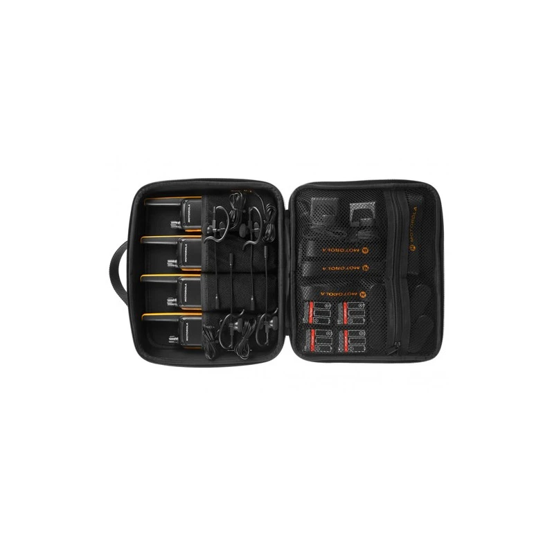 Package Includes: Suitcase with: 4 Walkie Talkies, 4 batteries, 2 double USB chargers, 4 belt clips, 4 micro-headphones, 4 straps, 4 personalization stickers.