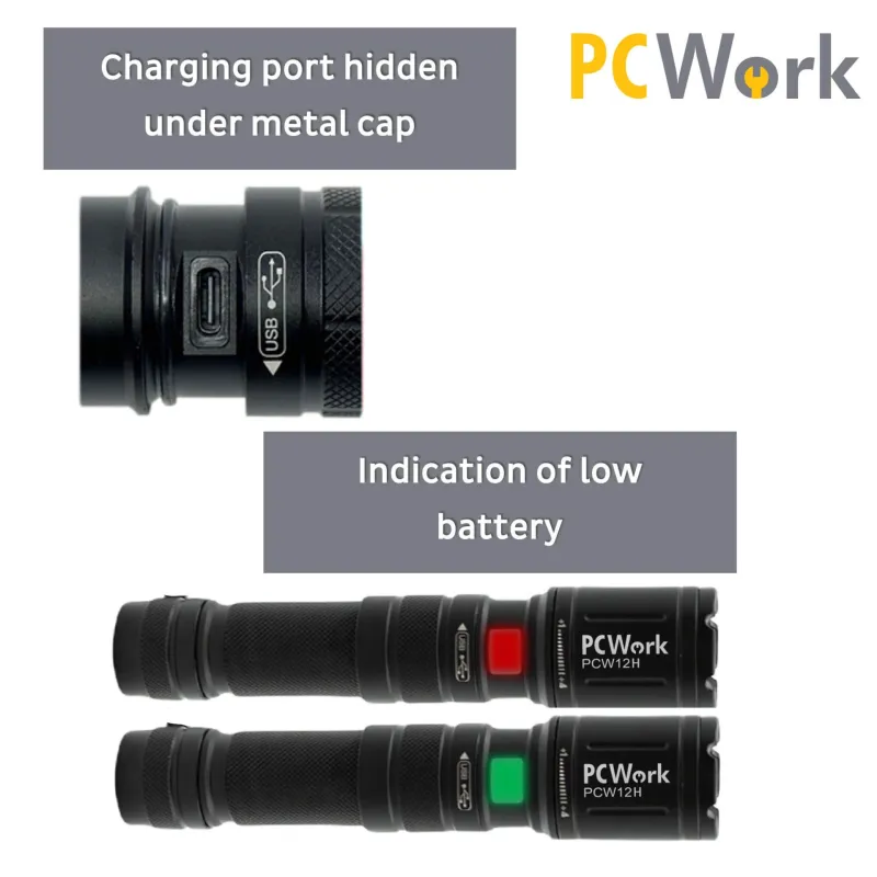 PCWorki PCW12H hübriid-LED-taskulamp on mitmekülgne, suure väljundvõimsusega valgustusvahend, mis kasutab CREE XML-U3 LED tehnoloogiat ja on loodud maksimaalse paindlikkuse tagamiseks nõudlikes keskkondades. See annab kuni 650 lm heledust.