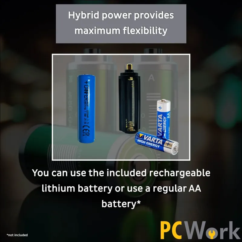 See hübriidsüsteem toetab kahte toitevõimalust: kaasasolevat 2000 mAh laetavat 18650 akut või kolme standardset AAA patareid. Laadimist hallatakse integreeritud USB-C pordi kaudu, mis on kaitstud spetsiaalse vee- ja tolmukindla alumiiniumkorgiga. Tööaeg ulatub 2,5 kuni 10 tunnini.
