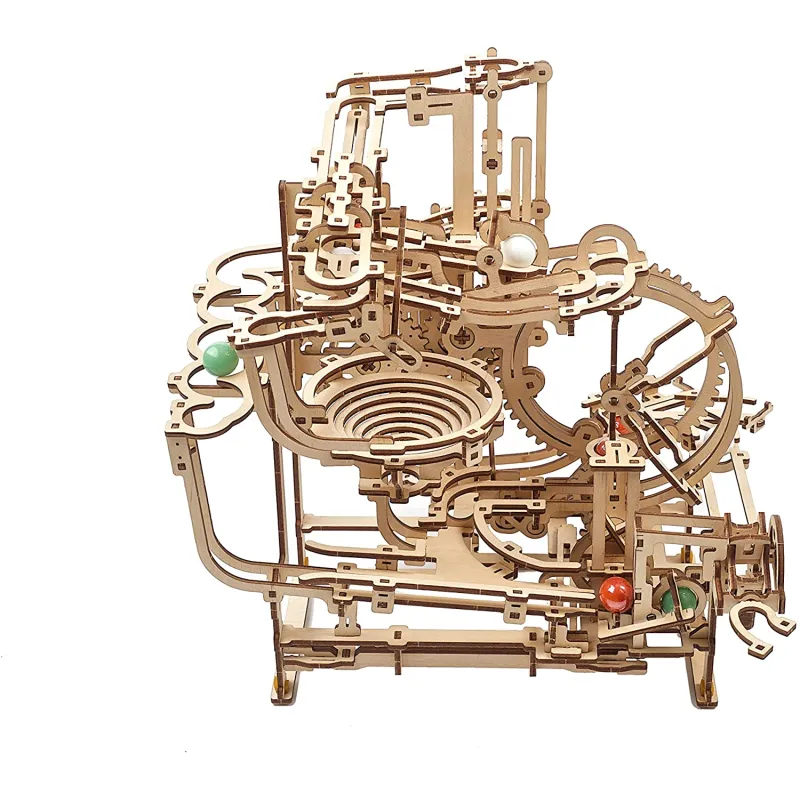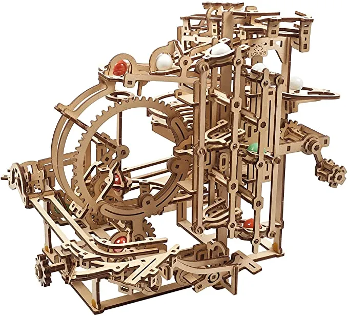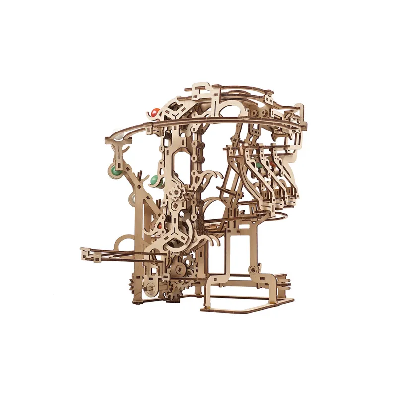 Mudelil on 3-astmeline vahelduv tõstuk, mis liigutab marmoreid edasi-tagasi, kui nad ronivad tippu, et alustada oma lõbustuspargi seiklusi. Milline marmorikilluke hõivab millise raja ja milline läheb esimesena alla? Marble Run'il on 3 palli akumulaator, kus kolmas pall avab värava esimese ja teise palli jaoks, mis jäävad kinni, saates kõik kolm erinevatele radadele. On kolm rada: esimene koosneb 2-pallilisest akumulaatorist ja voolikust, teine on C-kujulise haamri sees olev kiikuv haamer ja kolmas on keeris või trummel. Kõik õhupallid liiguvad lõpuks läbi kogumisaluse ja kiikhüppesse. Kanglülitusmehhanism saadab kuulid kas tagasiteed mööda kolmeastmelist lifti või (ja siinkohal muutub asi tõeliselt huvitavaks!) teise lisatud Ugears'i marmorirada.