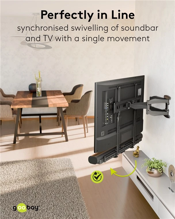 - Sünkroniseeritud liikumine tagab, et heliriba jääb ekraaniga joondatuks, kui see on kinnitatud täisliikuva telerikronsteini külge, tagades ühtlase helisuuna.