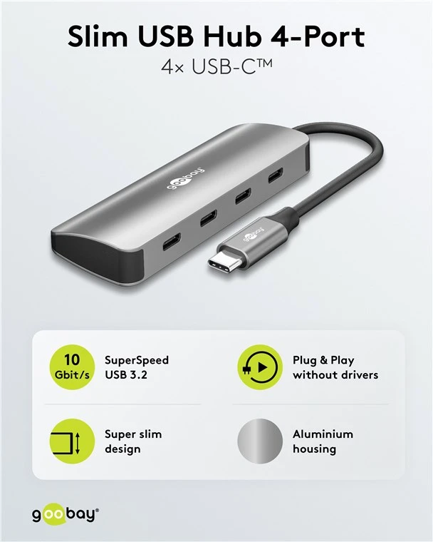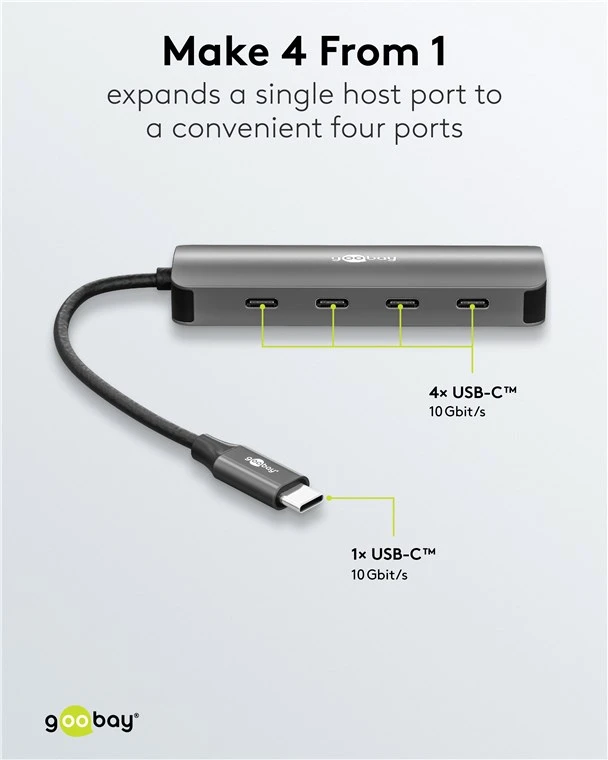 Õhuke hub korrutab ühenduse, sobib kõigile USB-C™ seadmetele ning võimaldab muljetavaldavat SuperSpeed andmeedastuskiirust kuni 10 Gbit/s.