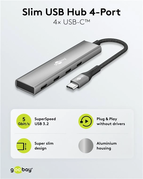 Mugav USB splitter laiendab ühe USB-C™ seadme pordi neljaks USB-C™ pordiks: tulemuseks on, et ühe tahvelarvuti või sülearvuti port teenindab kuni nelja perifeerset seadet.