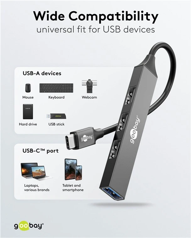 Maksimaalne ühenduvus tahvelarvutitele, nutitelefonidele ja sülearvutitele vaid ühe USB-C™ pesa kaudu: õhuke ja kompaktne jaotur laiendab ühendusvõimalusi, sobides USB-A seadmetele ning pakkudes samal ajal USB 3.2 standardi kaudu ülikiiret andmeedastust.