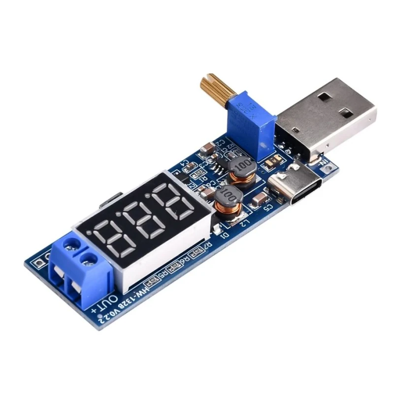 USB Toitemoodul DC/DC astme-üles / astme-alla tüüpi, mida toidetakse USB kaudu. Pöörlev potentsiomeeter reguleerib vajalikku pinget. Omadused: Üks nupp väljundi sisse- ja väljalülitamiseks. Sisse/välja lülitamise ekraan. Madala energiatarbe režiimi tugi. Unerežiimi tugi. Toetab nii standardset USB kui ka USB-C, samuti klemmide sisendpinget. Pöörleva käepidemega potentsiomeeter. Kasutusetapid: Ühenda standardse USB või USB-C või 'VIN+' ja 'VIN-' klemmide kaudu. Lülita ekraan sisse. Reguleeri potentsiomeetrit, et saada soovitud pinge. Ühenda koormus. Kasutusalad: Tavaline toiteallikas Akulaadija LED-draiver Instrumentide pinge näidik Testseade Vooluringi testimine Energia muundamine Tähelepanu! See ei ole suure võimsusega toiteallikas, palun kasuta seda ettenähtud võimsusvahemikus.
