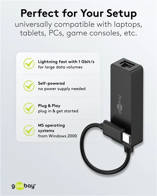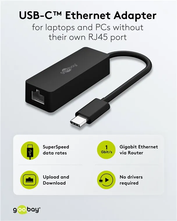 Goobay USB-C LAN-adapter (SKU: 76579-GBY) pakub usaldusväärset ja kiiret juhtmega võrguühendust arvutitele, sülearvutitele või MacBookidele, millel puudub spetsiaalne Etherneti port. Kasutades USB 3.1 standardit, tagab see adapter stabiilse Gigabit Etherneti ühenduvuse nõudlike rakenduste jaoks.