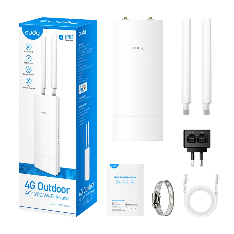 Cudy LT700 Outdoor 1.0 on vastupidav 4G LTE Advanced CPE ruuter, mis on loodud posti või seina külge kinnitamiseks, et pakkuda usaldusväärset välitingimustes internetiühendust.