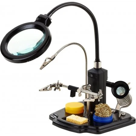 The magnifying lamp with integrated third hand is intended for illuminating work areas and it is equipped with a magnifying glass.