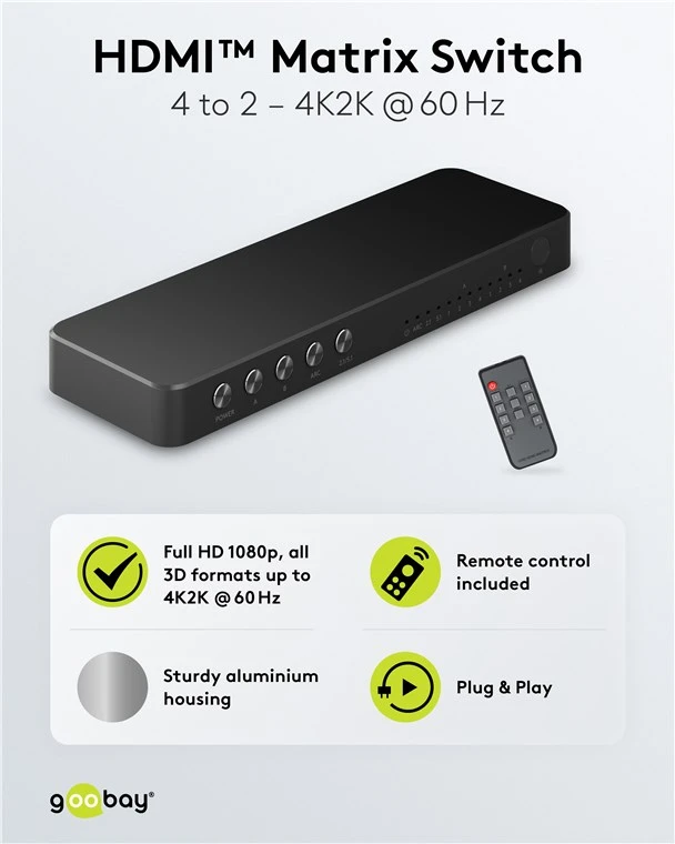 HDMI™ switch 4x2 supports Ultra HD, HDTV and all 3D formats up to 4K2K @ 60 Hz