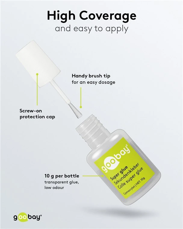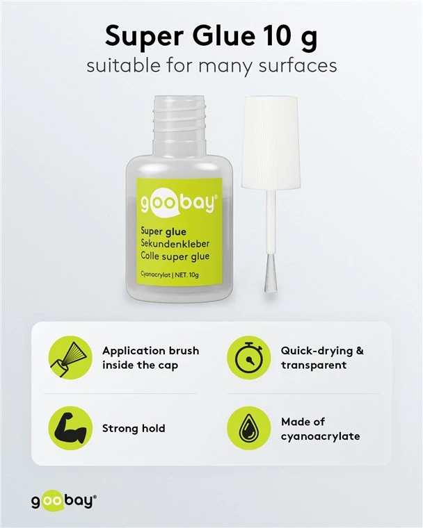Adhesive consists of cyanoacrylate,hardens after a few seconds and sticks strongly.