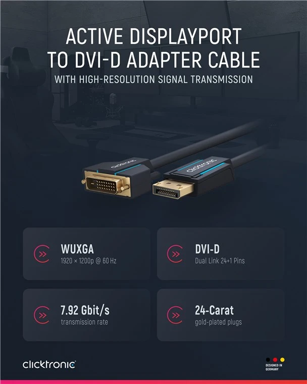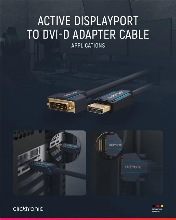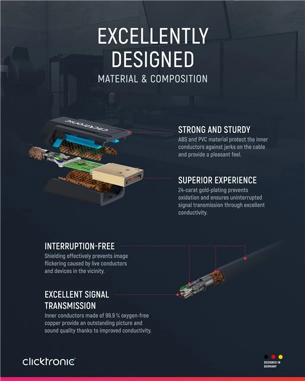 Clicktronic attaches great importance to durability and stability. Our quality promise: 10-year warranty on our DisplayPort™ cables. The proprietary construction of our connection cables makes them extremely robust. The three-part connector construction made of PVC and ABS components compensates for jerky pulling on the cable, making it ideally protected against cable breaks. High-quality, gold-plated contacts and pure copper conductors transmit audio and video signals in maximum quality for a perfect home cinema and gaming experience. The Clicktronic DisplayPort™ cable enables a razor-sharp image and has a very fast transmission speed.