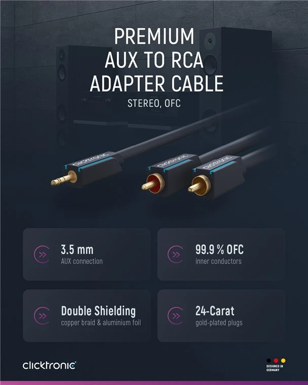 24-carat gold-plated, stainless RCA plugs for minimal transmission resistance and crystal-clear sound