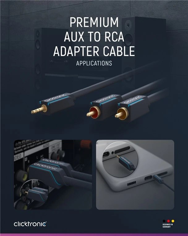 RCA to jack cable as the ideal solution for connecting devices with 3.5 mm jack sockets such as smartphones or tablets to hi-fi systems or speakers with RCA inputs.