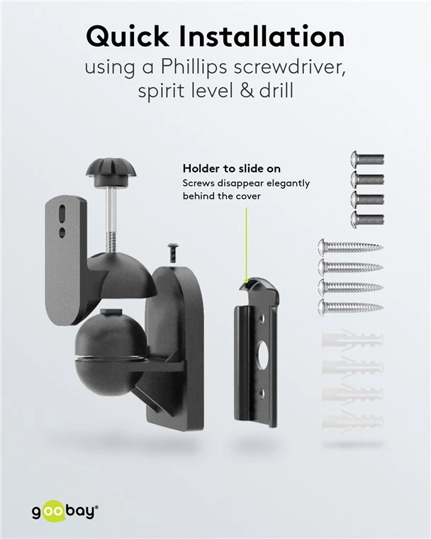 Conduct your own soundscapes: With the universal mount, you can quickly and easily install your satellite speakers on the wall. Simply attach the wall plate and slide the bracket with the loudspeaker over it. The round head joint allows you to adjust the perfect position without tools. In no time at all, you can enjoy rich sound and a crackling popcorn atmosphere.