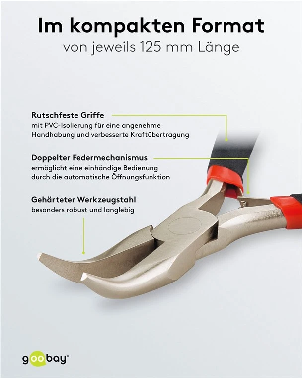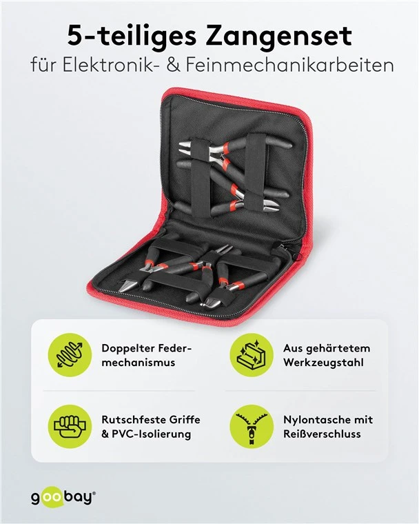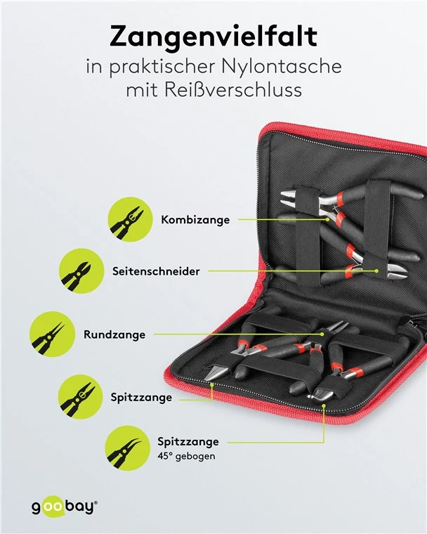 High-precision electronics pliers in a set of 1x needle-nose pliers, 1x 45° angled bent nose pliers, 1x round-nose pliers, 1x side cutter, 1x combination pliers