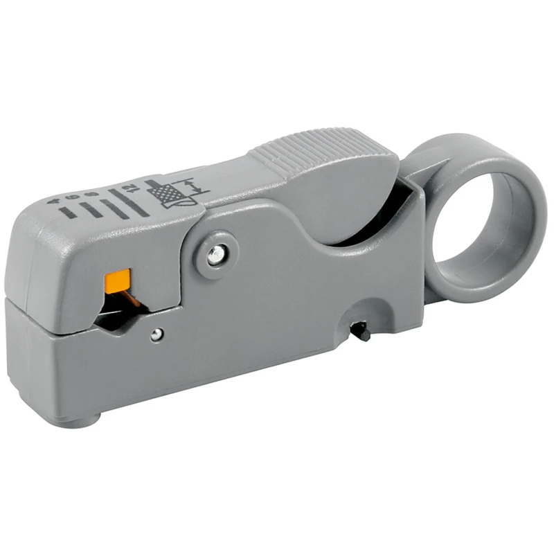 Flexible and easy to use: Just insert the cable into the tool, press it closed and turn it using the finger loop until you've cut throughthe sheath and insulation/dielectric. The wire and insulation are exposed separately, quickly and with little effort. The two cutting blades can be flexibly adjusted to different cable diameters using the enclosed key.