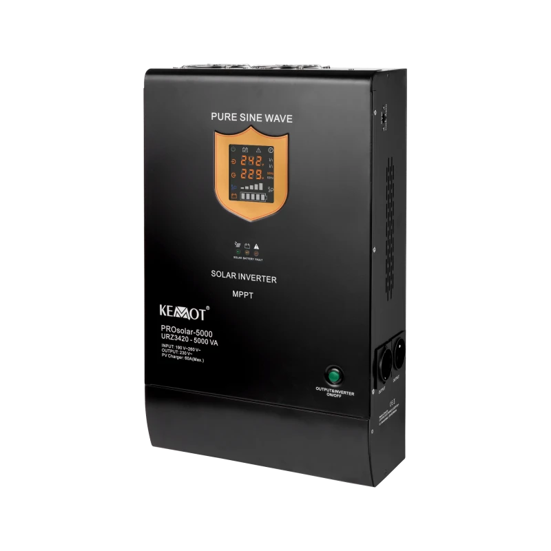 KEMOT PROsolar-5000 Päikeseinverter KEMOT PROsolar seeria päikeseinverterid, mille nominaalne väljundvõimsus on 500 W kuni 2500 W, võimaldavad tänu oma ulatuslikule funktsionaalsusele koostööd fotogalvaaniliste moodulite ja elektrivõrguga. Seadmed ühendavad endas päikeselaadija, inverteri ja akulaadija funktsioonid.