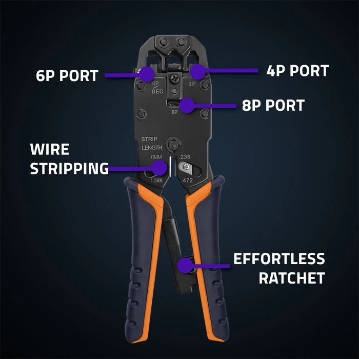 The modular connector crimper is one of the key tools used in the installation, maintenance and repair of computer networks. Designed to crimp 8p (RJ-45), 6p (RJ-12) and 4p (RJ-11) type connectors. Precision blades guarantee accurate cutting and crimping, this tool is adapted to handle different types of cables, minimising the risk of damage to cables. It has a automatic locking device that guarantees the correct crimping forceenables home users to repair network connections themselves.